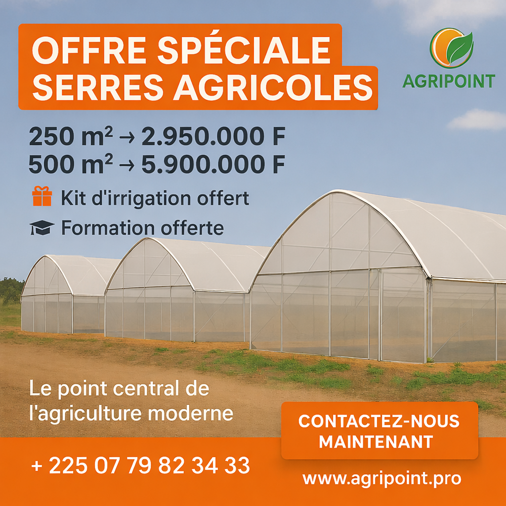 Chez AGRIPOINT, nos serres agricoles sont conçues pour booster votre production, protéger vos plants des aléas climatiques et vous garantir des récoltes régulières, rentables et de qualité. Que ce soit pour la tomate, le piment, le cornichon ou le Concombre..., nos serres tunnel et Multi chapelles s’adaptent à votre terrain et à vos ambitions. Installez, cultivez, récoltez… avec un maximum d’efficacité !